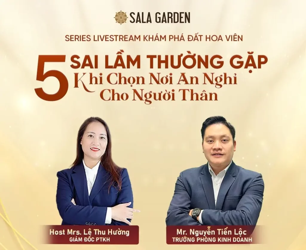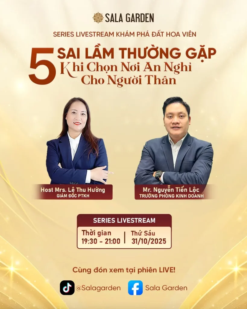 Hãy cùng Sala Garden khám phá sâu hơn qua buổi livestream đặc biệt tuần này: “5 Sai Lầm Thường Gặp Khi Chọn Nơi An Nghỉ Cho Người Thân”. Chúng tôi sẽ phân tích những lỗi sai tưởng chừng nhỏ bé nhưng lại ảnh hưởng lớn đến sự an lòng của bạn và thế hệ sau. Từ việc bỏ qua yếu tố phong thủy, chọn vị trí không phù hợp, đến những vấn đề về chi phí và thủ tục pháp lý – tất cả sẽ được làm rõ để giúp bạn đưa ra quyết định sáng suốt.